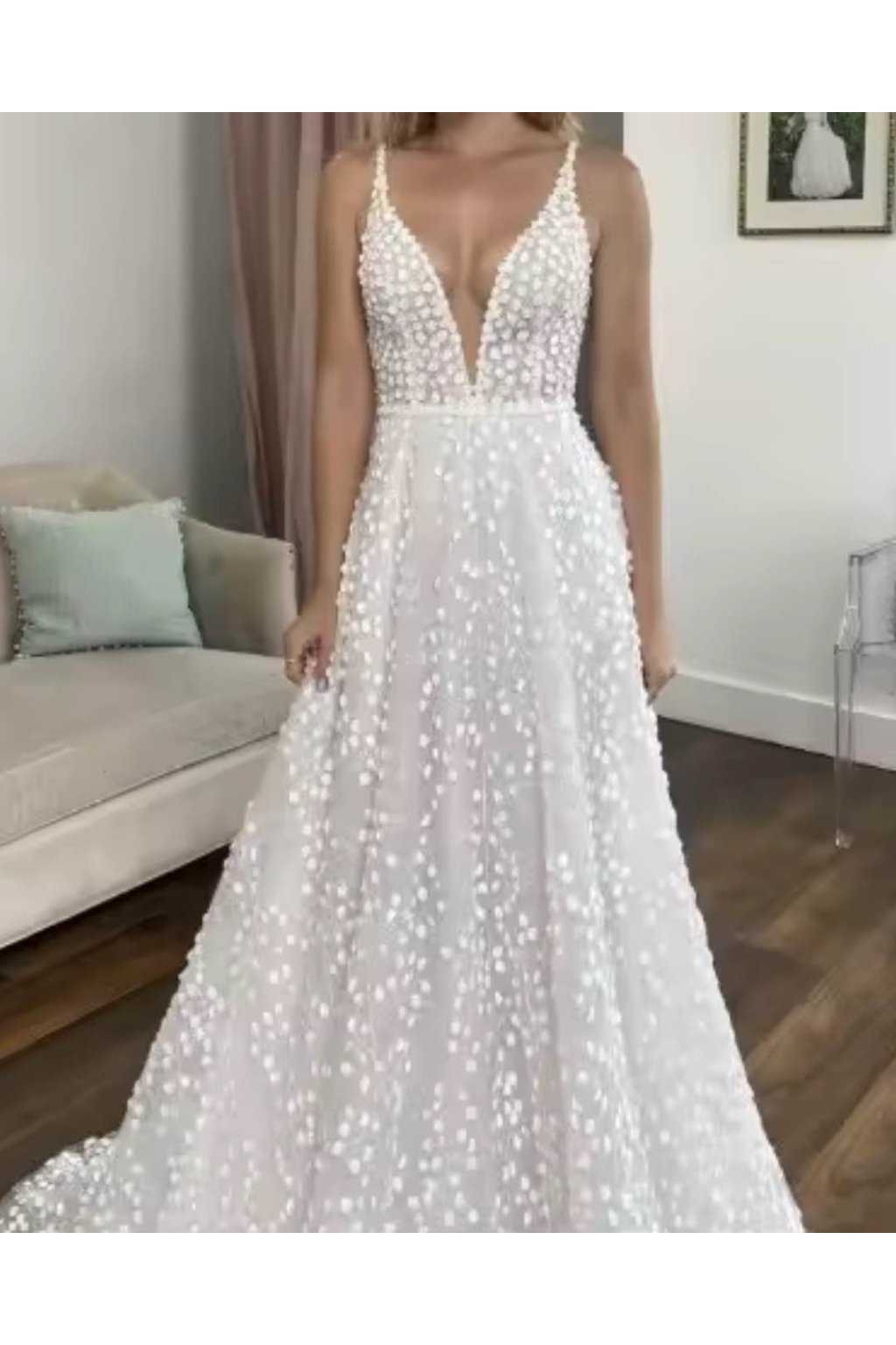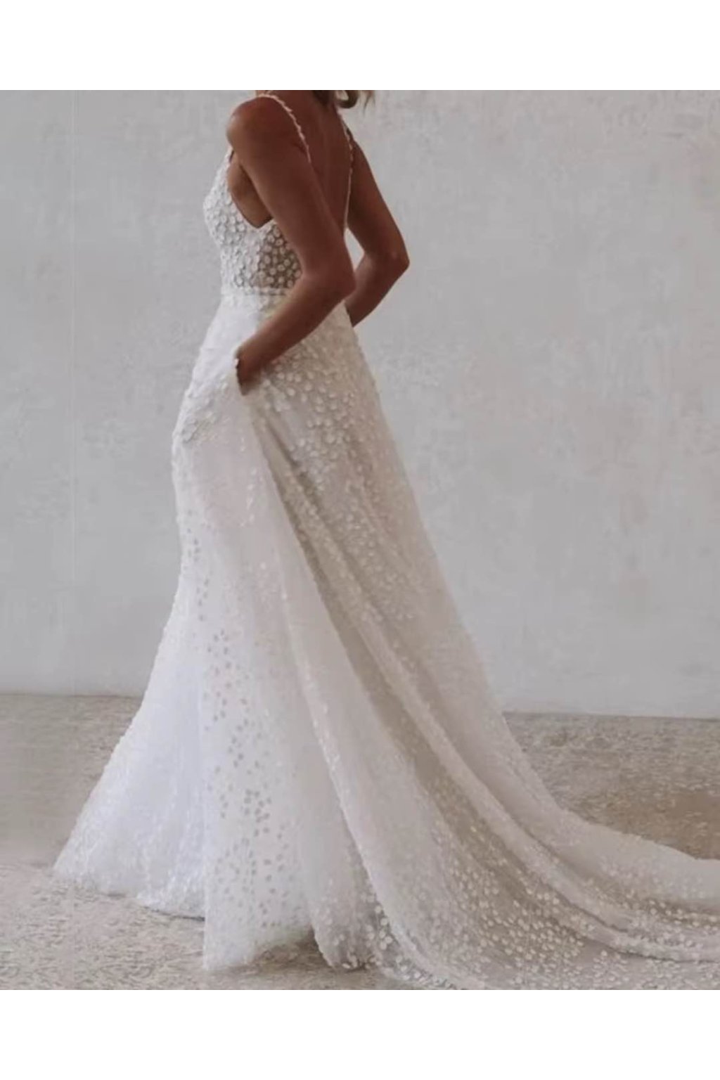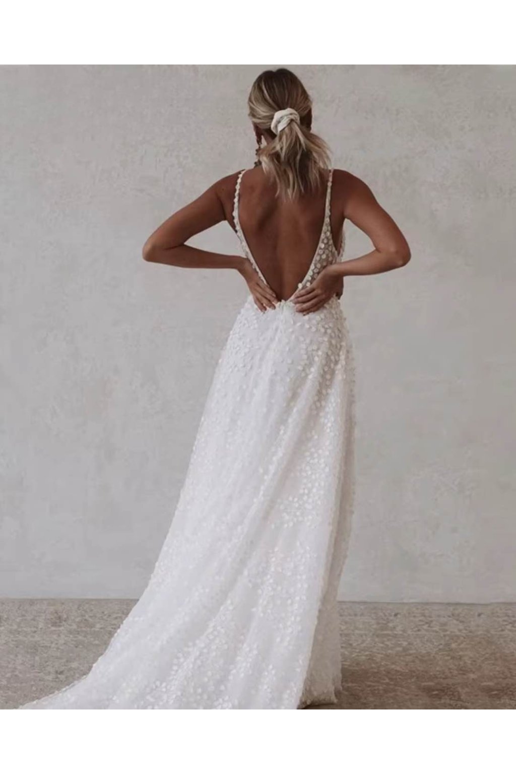 Tyto svatební šaty jsou moderní, čisté a lehce romantické – ideální pro nevěsty, které chtějí vypadat něžně, ale zároveň stylově. Výstřih do V krásně prodlužuje siluetu, tenká špagetová ramínka působí jemně a áčkový střih (A-line) lichotí postavě a pohodlně se nosí i v průběhu celého dne. Záda jsou odhalená (backless) a celkový dojem doplňuje tylová sukně v délce až na zem s elegantní krátkou vlečkou (sweep/brush train).