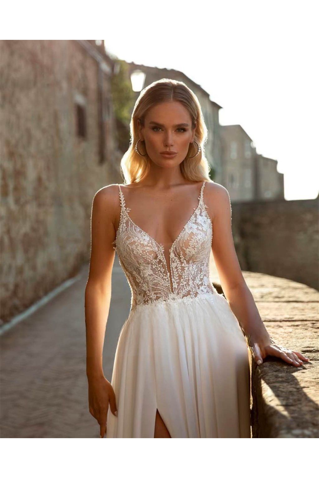 Šaty Eliana jsou lehké a romantické A-line šaty se splývavou šifonovou sukní. Krajkové aplikace s florálním motivem, V výstřih a tenká ramínka vytváří jemný, elegantní look. Nechybí všitá podprsenka a decentní chapel vlečka pro slavnostní efekt.