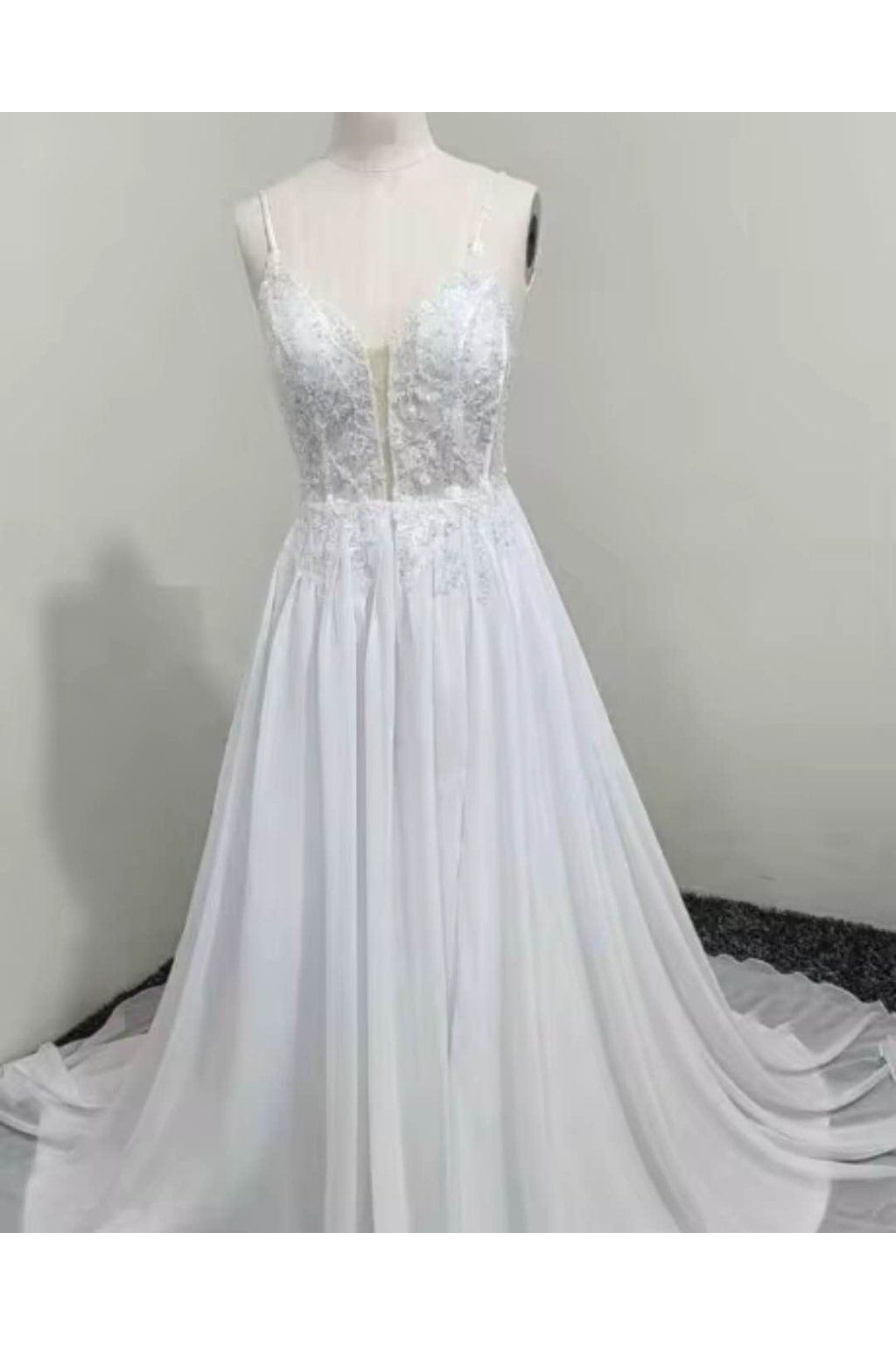 V výstřih působí žensky a vzdušně, spaghetti ramínka dodají jemnost a pohodlí. Živůtek zdobí krajkové aplikace s florálním motivem a nechybí všitá podprsenka pro lepší oporu. Záda jsou řešená knoflíčky a lehká šifonová sukně končí chapel vlečkou, která působí slavnostně, ale stále elegantně a prakticky.
