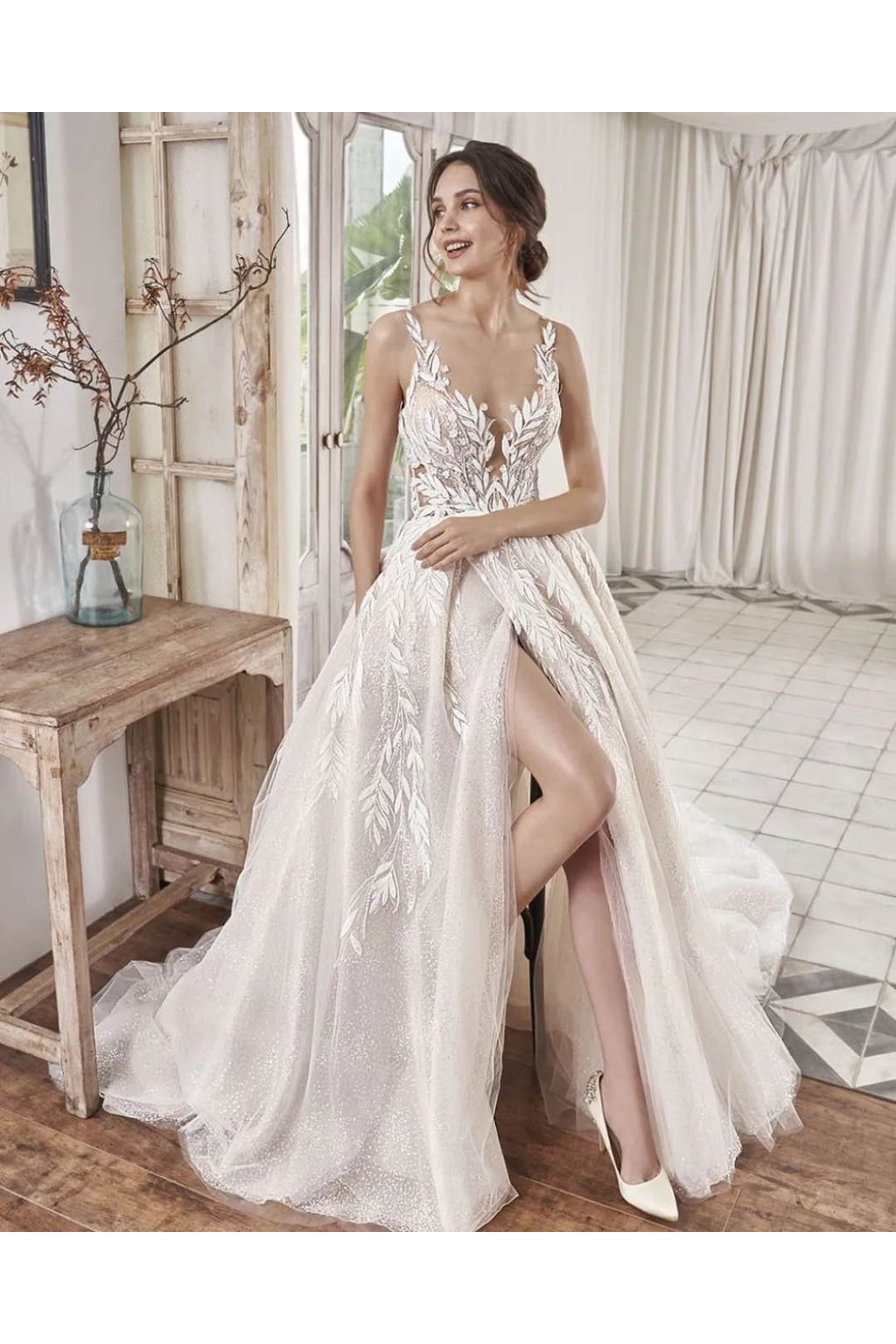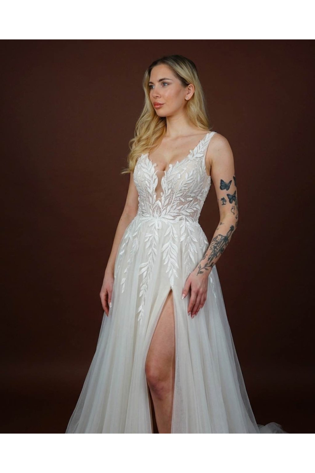Tyto svatební šaty jsou jako dělané pro nevěstu, která miluje boho atmosféru, lehkost a romantické detaily. Véčkový výstřih krásně prodlouží siluetu a střih A-line (do áčka) lichotí postavě, aniž by omezoval pohyb.
