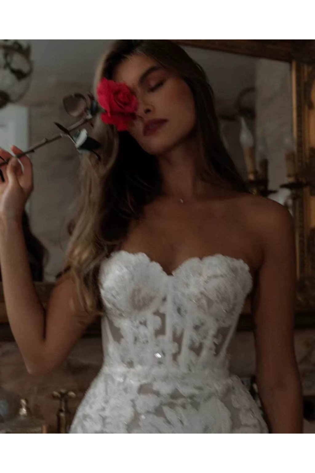 Jemná krajka s aplikacemi dodává šatům romantický nádech, zatímco áčková silueta krásně lichotí postavě. Srdíčkový výstřih v kombinaci s odhalenými rameny působí žensky a elegantně, aniž by byl přehnaný. Díky šněrování na zádechse šaty perfektně přizpůsobí postavě a zajistí maximální komfort.
