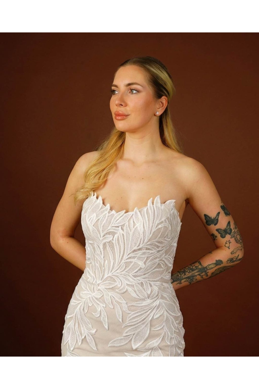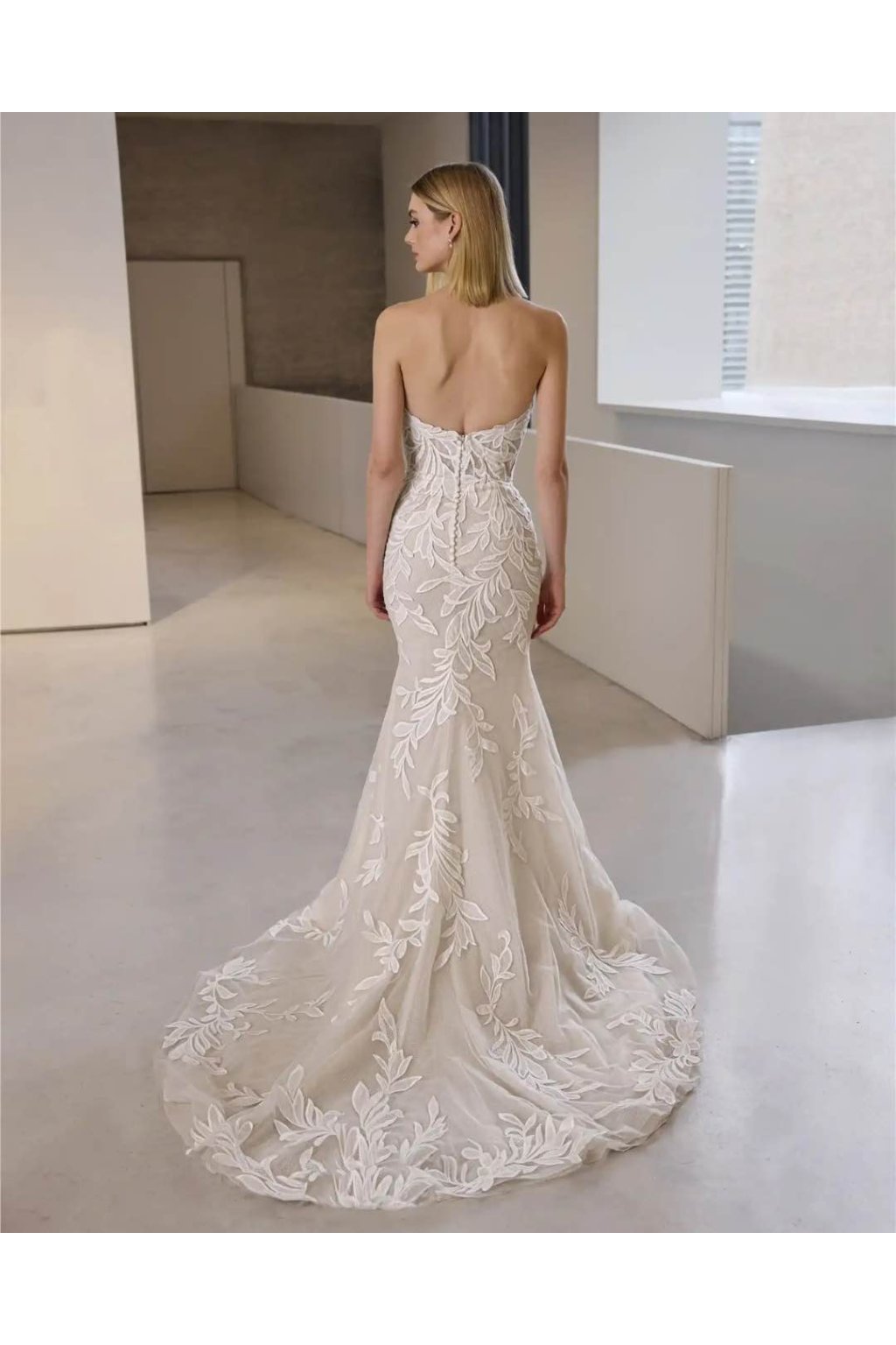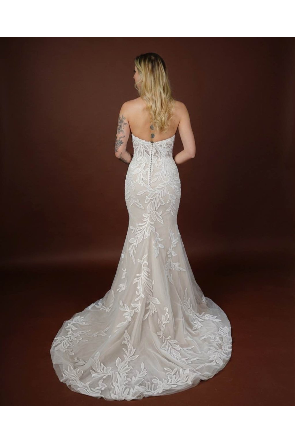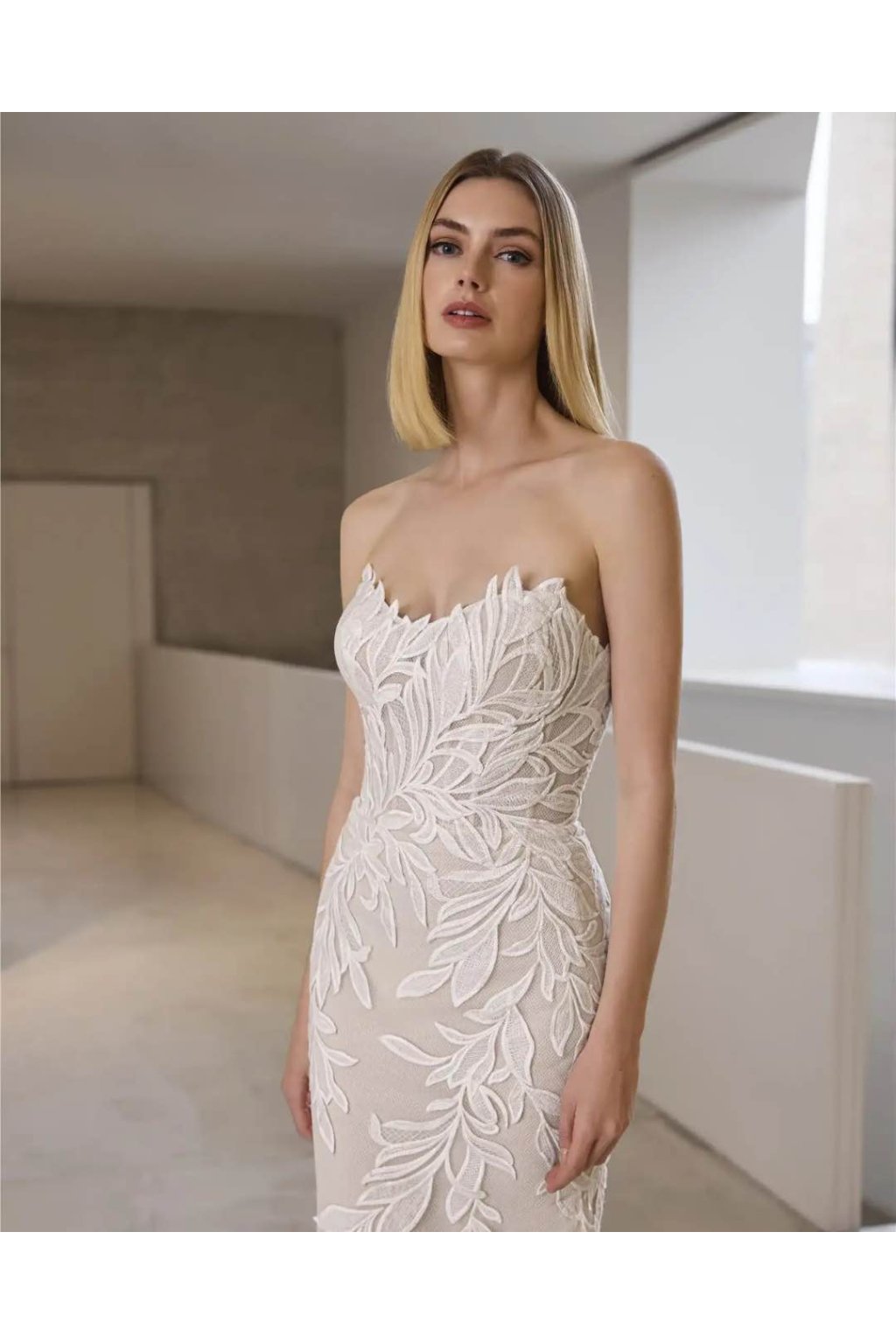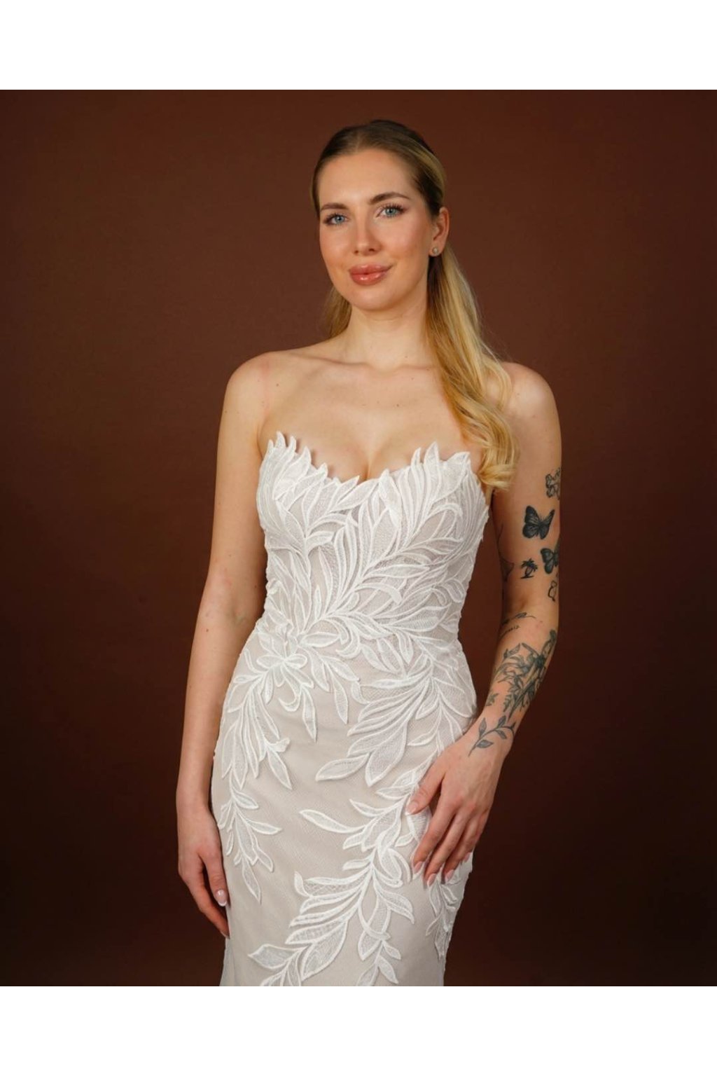 Model Livia – moderní mermaid svatební šaty bez ramínek s listovou krajkou, knoflíčky na zádech a kapličkovou vlečkou. Šité na míru, tylový základ, všitá podprsenka.