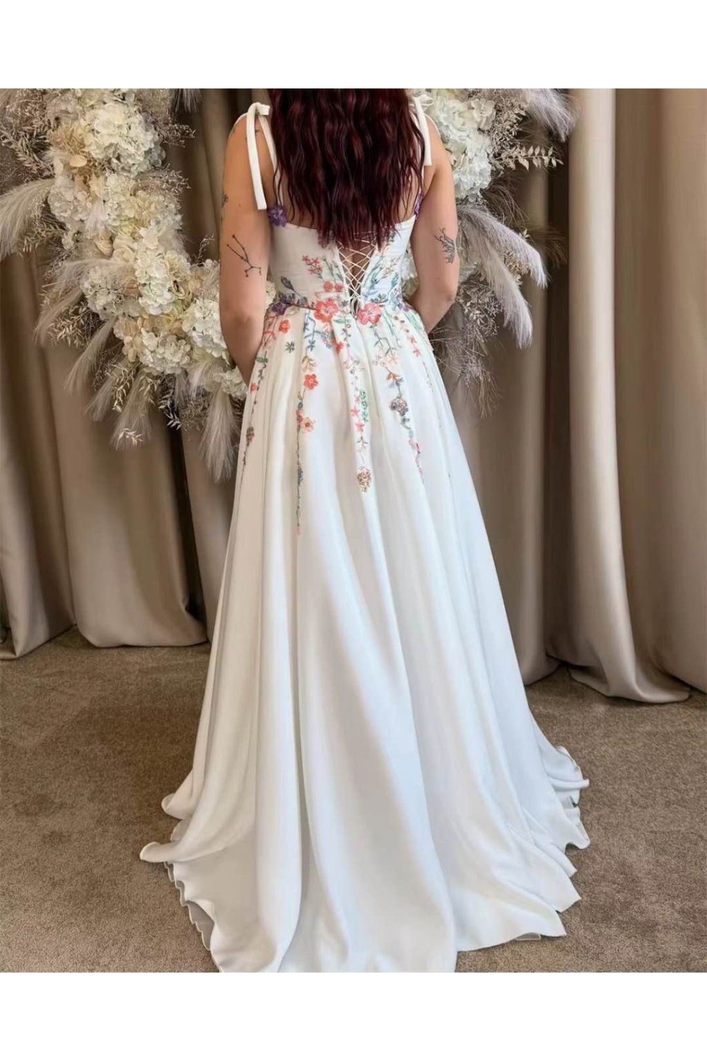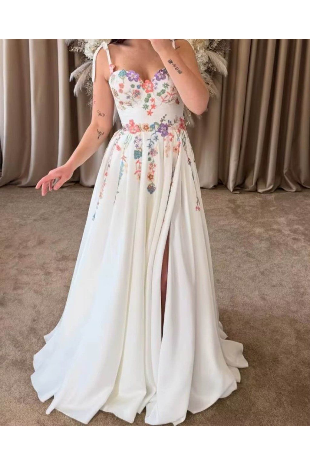 Srdíčkový výstřih (sweetheart) jemně zvýrazní dekolt a spaghetti ramínka dodají šatům něžný vzhled. Saténový materiál působí luxusně na fotkách i naživo, zatímco řasení (ruched) hezky tvaruje siluetu. Živůtek zdobí florální aplikace a nechybí všitá podprsenka pro oporu. Délka je po zem, šaty jsou bez vlečky – ideální i na tanec.