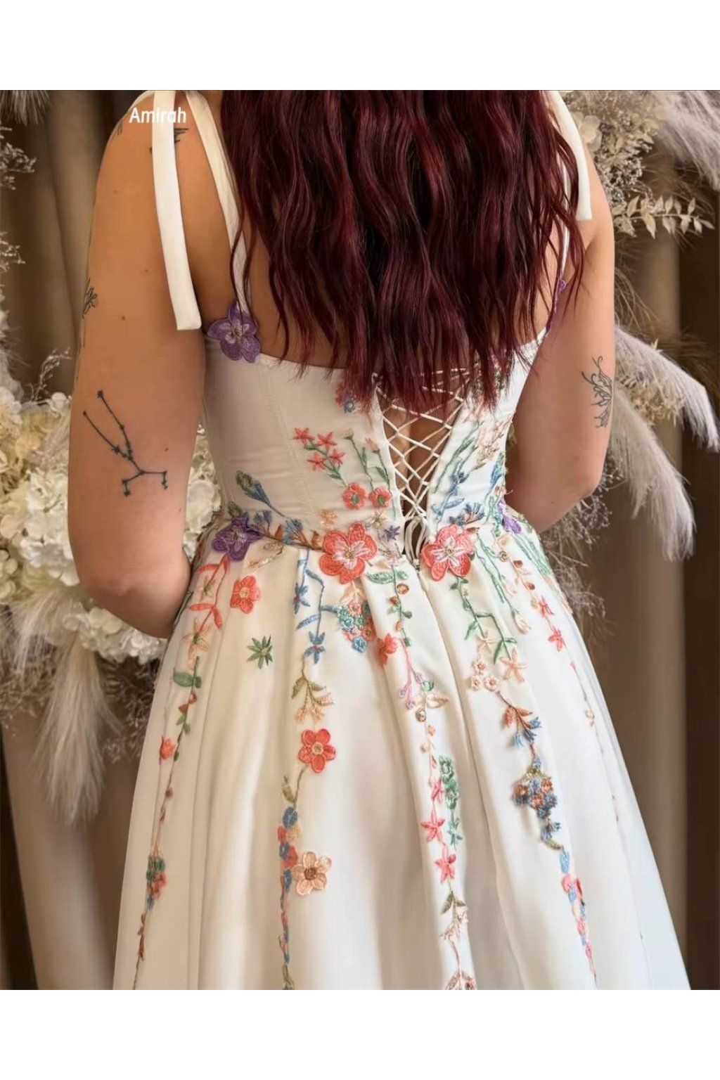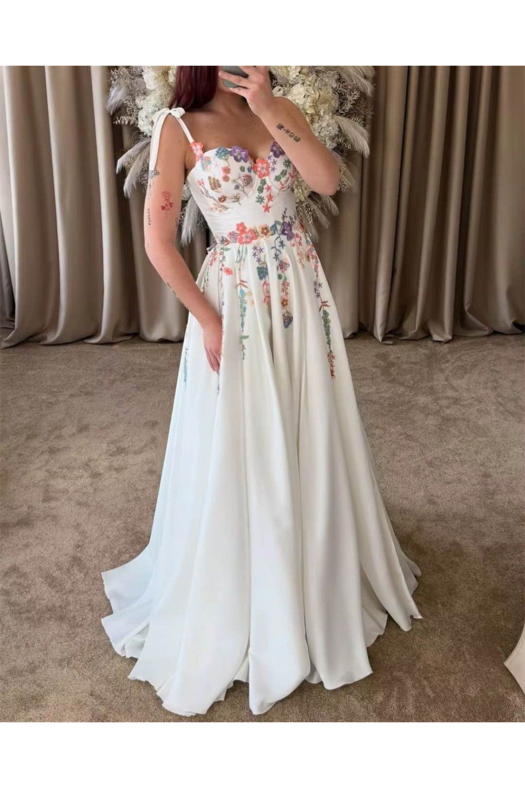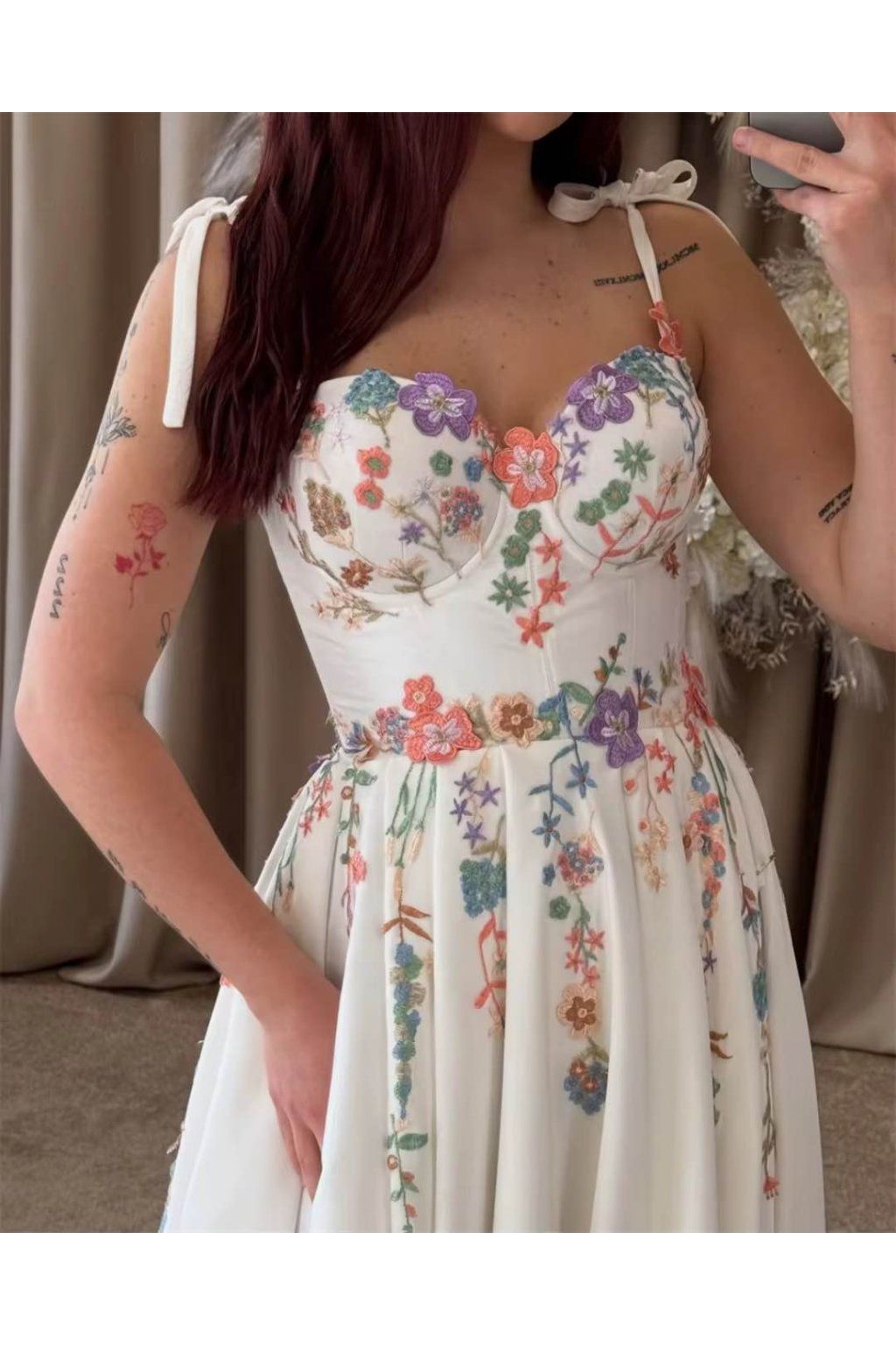 Marika – moderní A-line šaty se srdíčkovým výstřihem a florálními aplikacemi