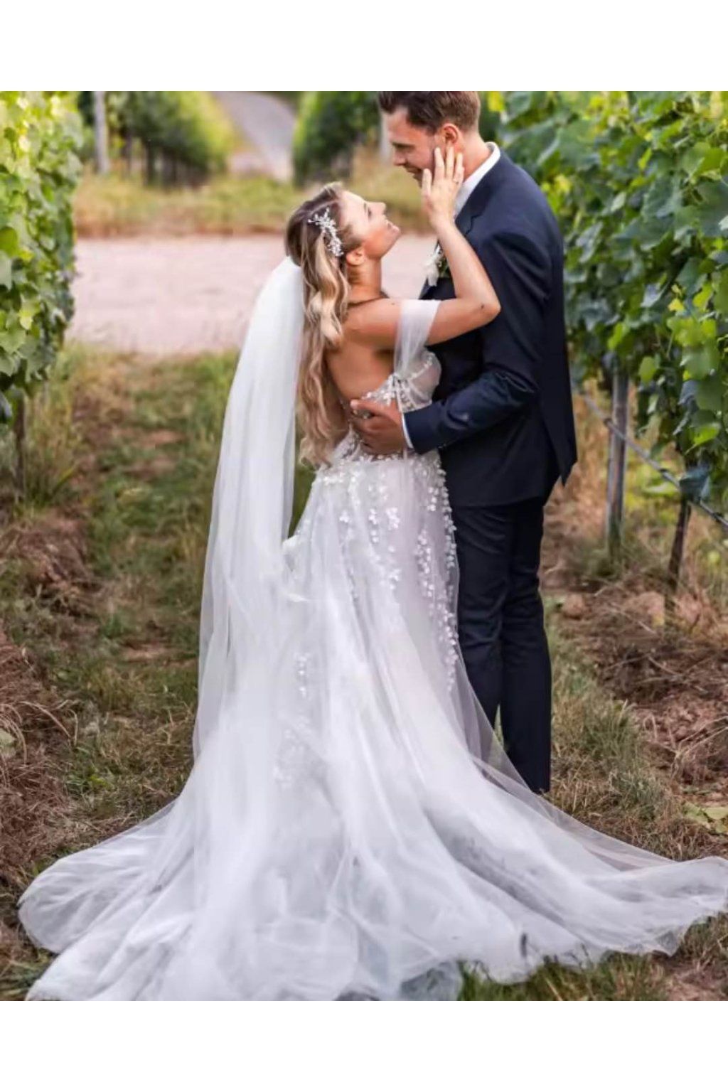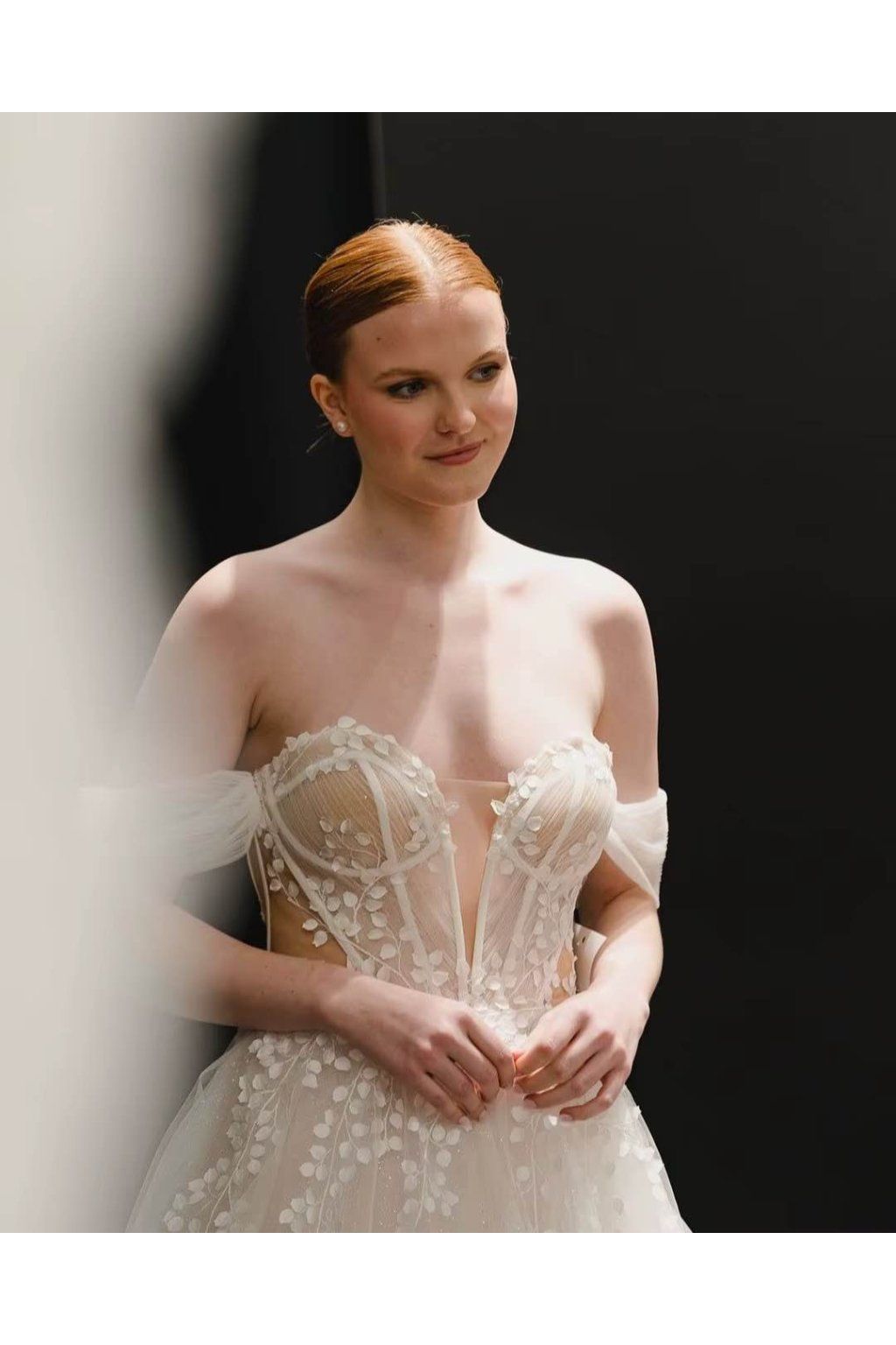 Svatební šaty Marina jsou klasické A-line šaty se srdíčkovým výstřihem a jemným illusion efektem z vyšívané organzy a tylu. Krajkové aplikace a sklady dodají luxusní detail, nechybí všitá podprsenka a zapínání na zip.