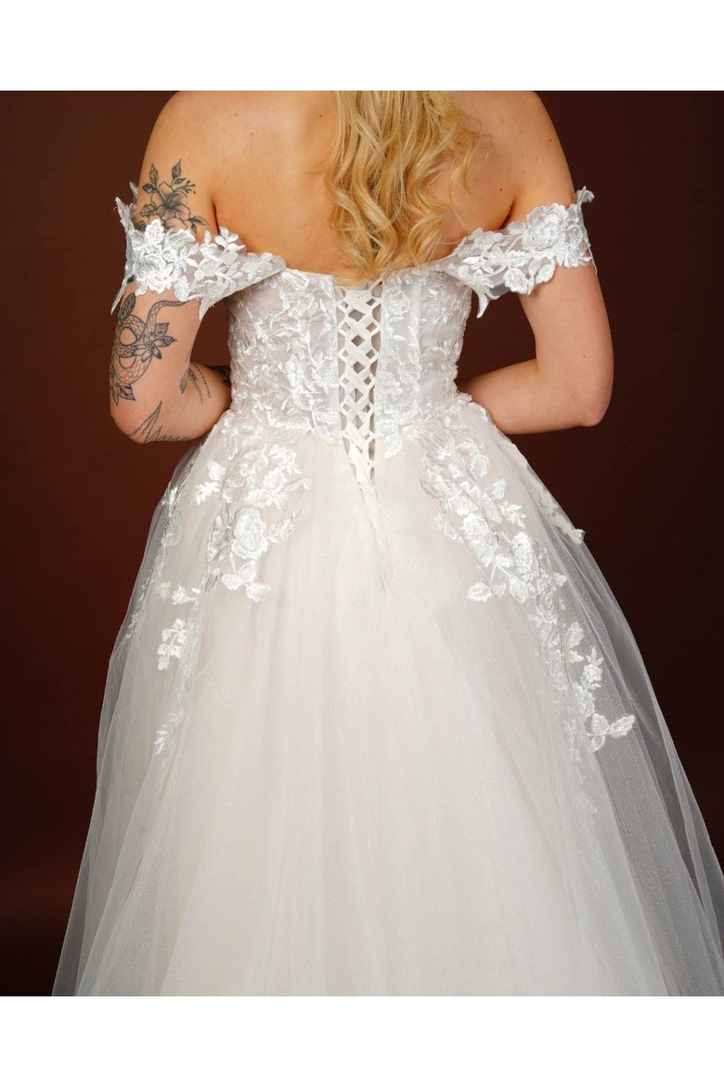 Romantické svatební šaty s jemnými květinovými aplikacemi. Sweetheart výstřih, off-shoulder rukávy a A-line střih krásně zvýrazní postavu. Lehká tylová sukně a šněrování na zádech zajistí pohodlné nošení po celý den. Elegantní volba pro něžnou a moderní nevěstu.