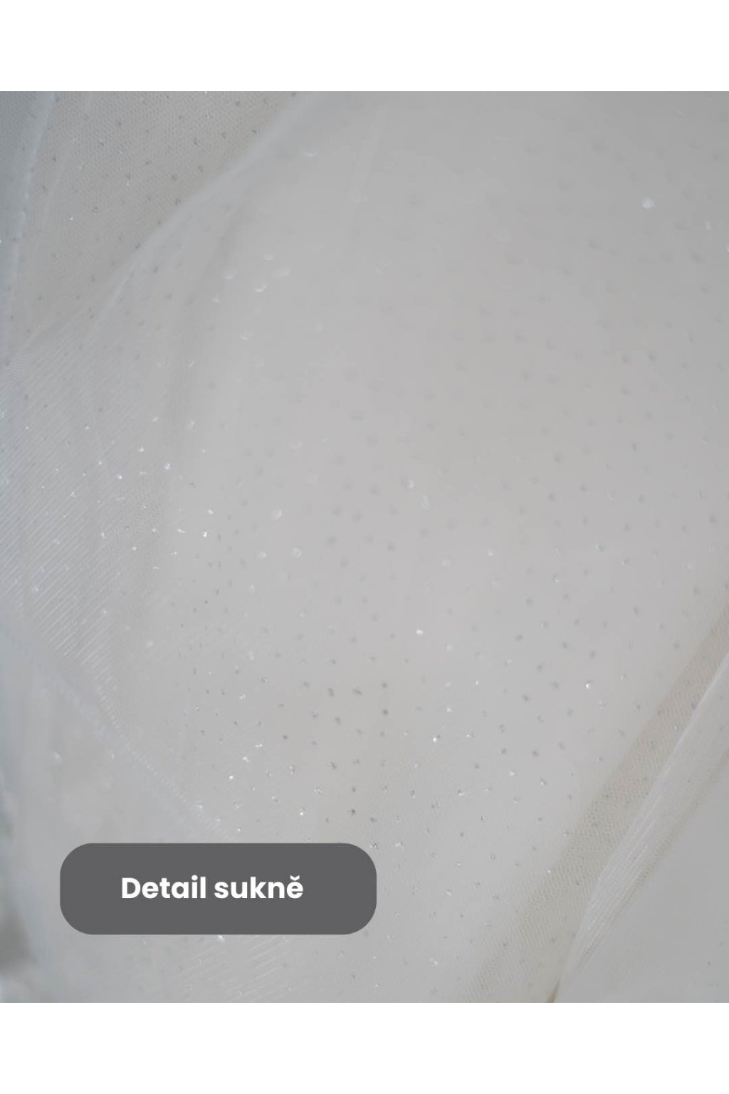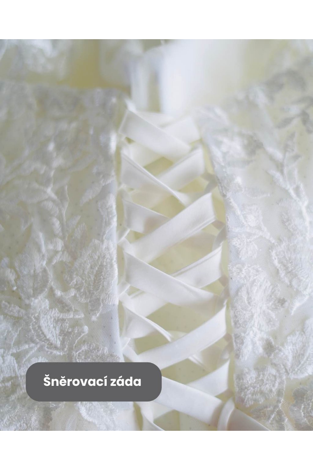 Tyto svatební šaty jsou stvořené pro nevěstu, která chce vypadat něžně, elegantně a zároveň výjimečně. Korzet s sweetheart výstřihem a jemnými off-shoulder rukávy krásně zvýrazní dekolt i ramena, zatímco bohatá tylová sukně vytváří lehký, snový pohyb při každém kroku.
