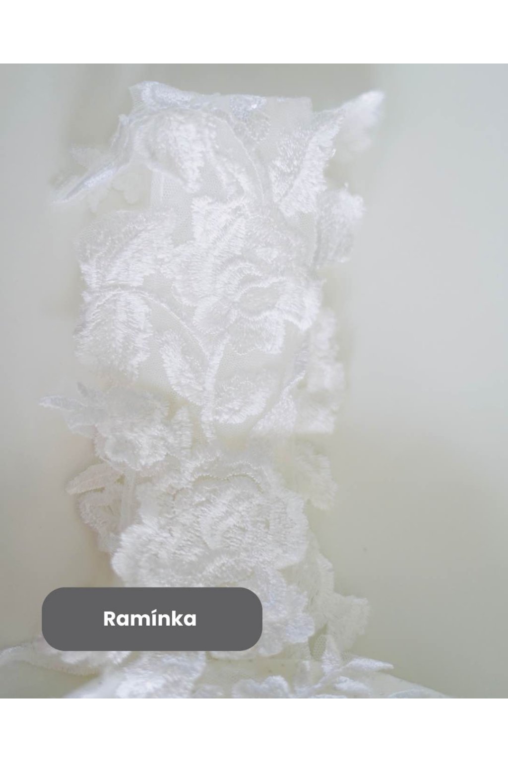 Luxusní květinové aplikace dodávají šatům detail, který působí ručně zpracovaným dojmem. Šaty mají A-line siluetu, která lichotí většině postav, a pohodlné šněrování na zádech, díky kterému si je nevěsta snadno přizpůsobí své postavě.