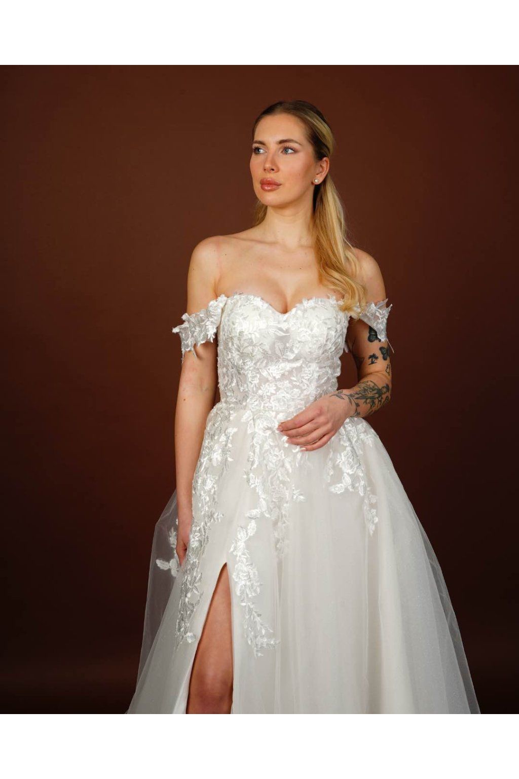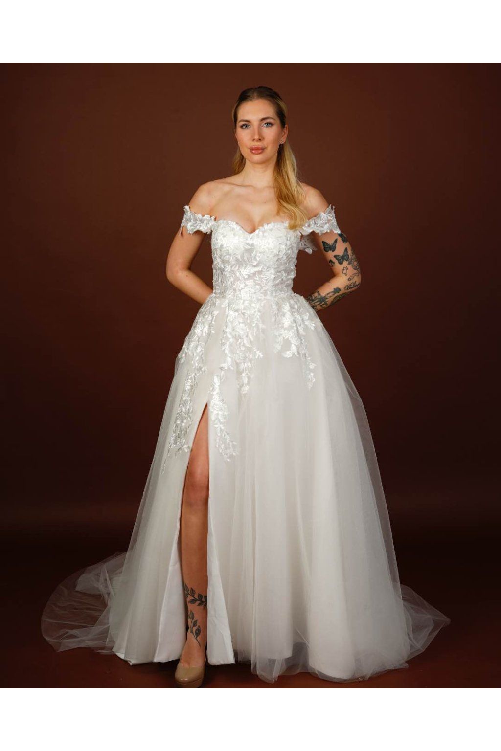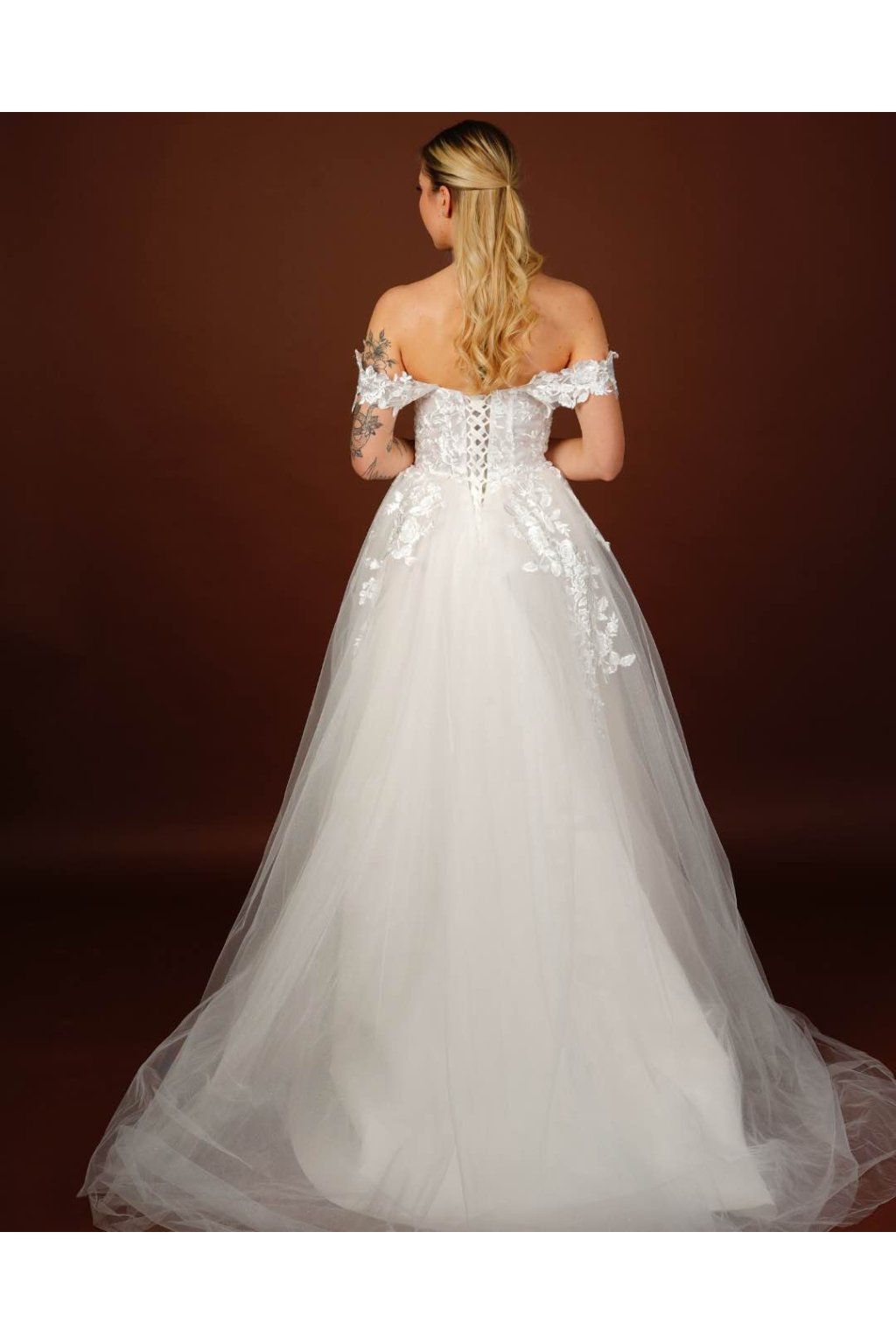 Romantické svatební šaty s jemnými květinovými aplikacemi. Sweetheart výstřih, off-shoulder rukávy a A-line střih krásně zvýrazní postavu. Lehká tylová sukně a šněrování na zádech zajistí pohodlné nošení po celý den. Elegantní volba pro něžnou a moderní nevěstu.