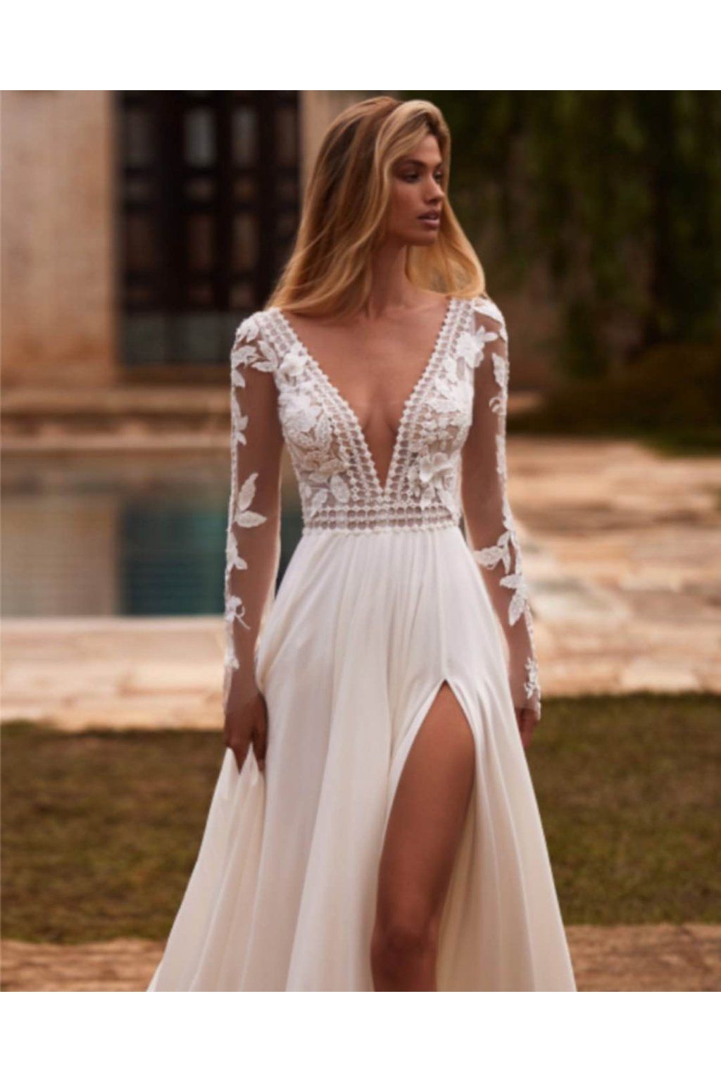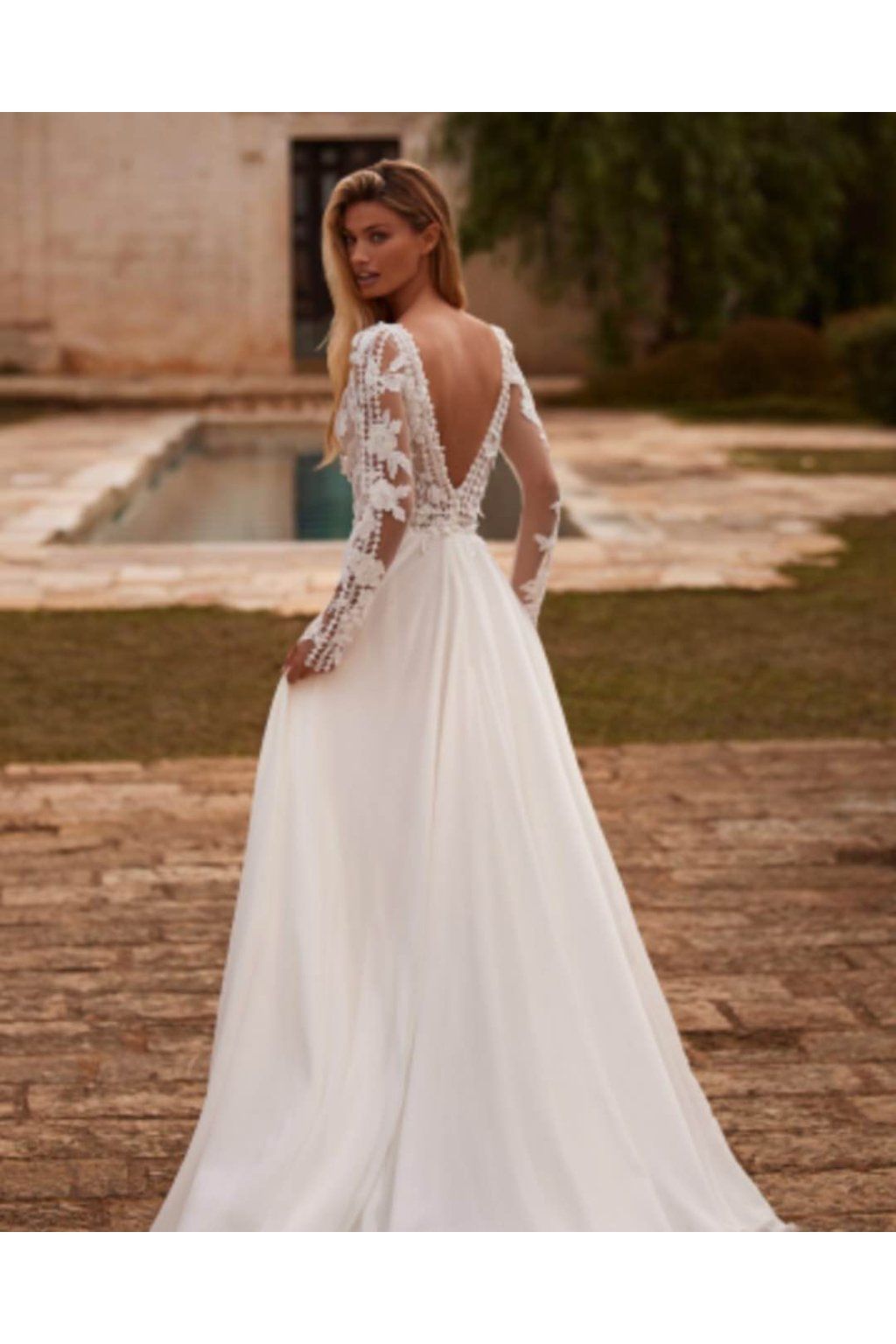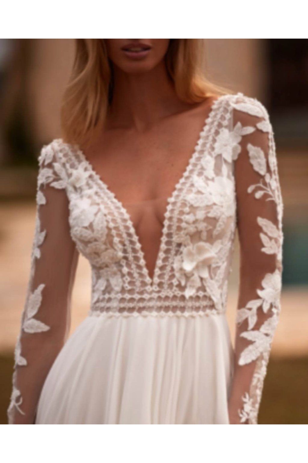 Reya jsou romantické boho svatební šaty s dlouhým rukávem, výstřihem do V, odhalenými zády a lehkou šifonovou sukní. Jemné krajkové aplikace a A-line střih vytváří něžný a elegantní model, který je ideální pro svatbu v přírodě, na pláži i klasický obřad.