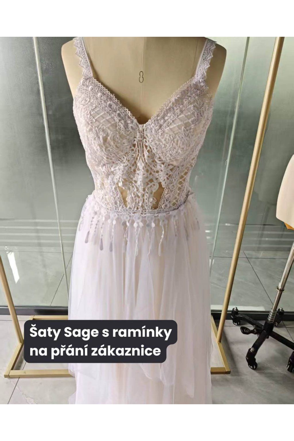 Šaty mají ženský výstřih do V a něžný iluzivní prvek (illusion), který dodá modelu lehce „vílovský“ efekt. Zdobení tvoří detailní aplikace, elegantní drapování a boho třásně, které se při chůzi krásně hýbou. Záda jsou řešená šněrováním (lace-up), takže si šaty snadno přizpůsobíš a zároveň získáš krásný detail na fotkách.