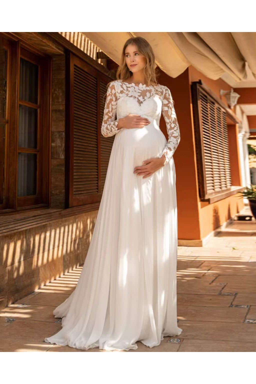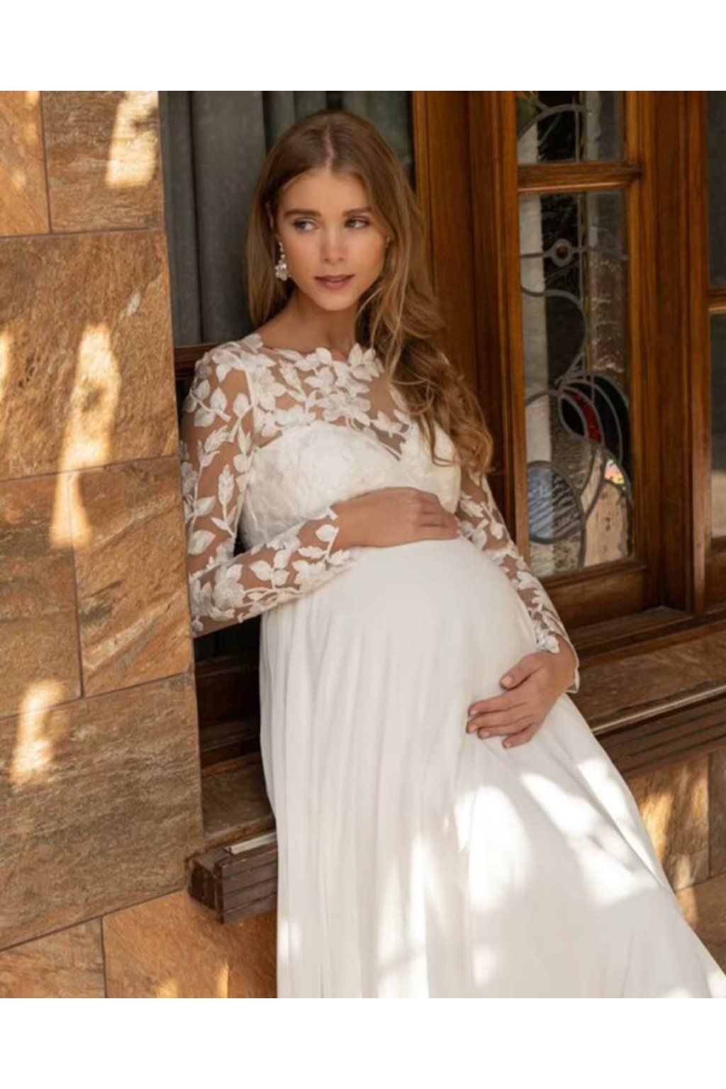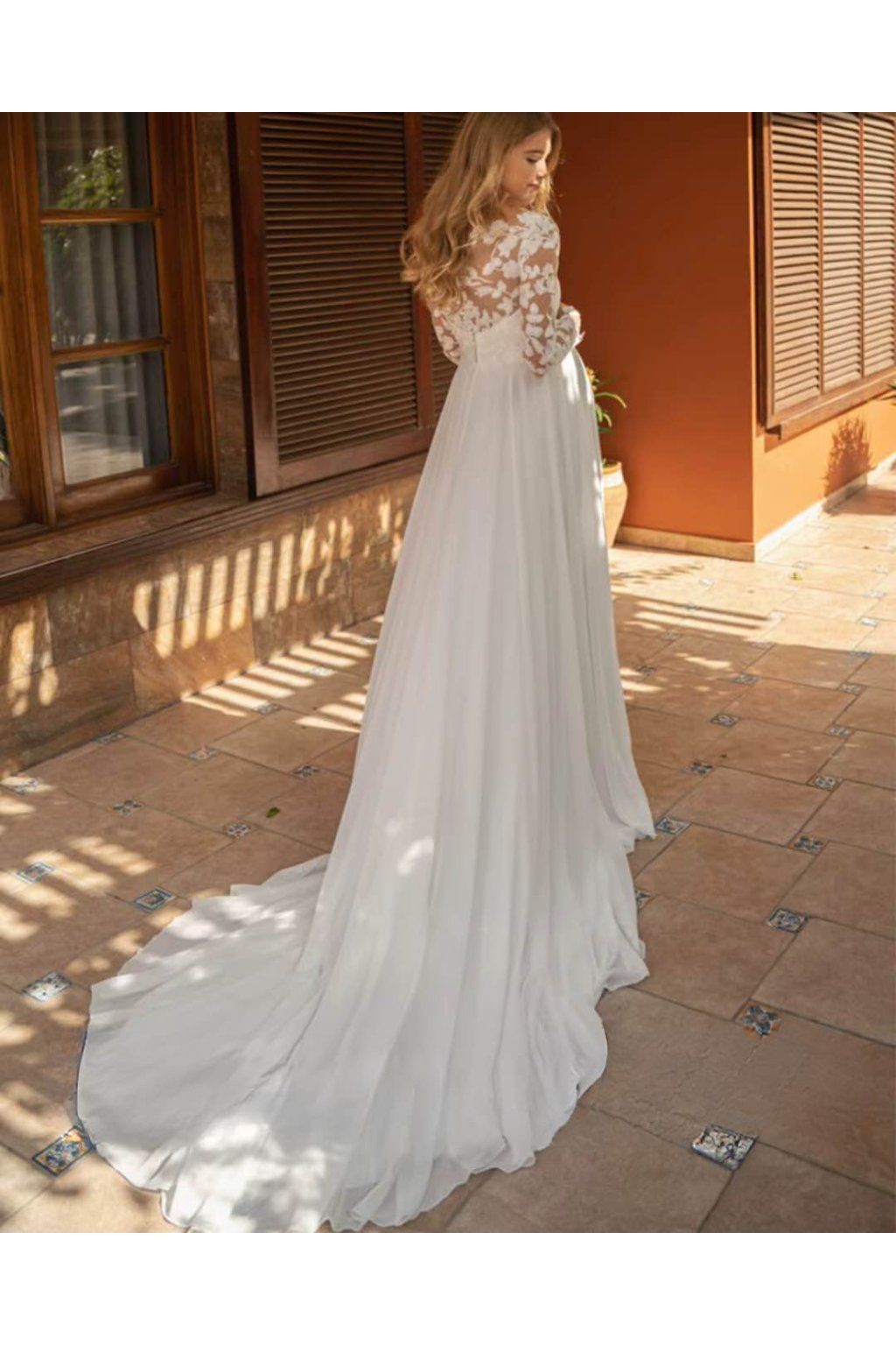 Elegantní svatební šaty v A-line střihu s dlouhými rukávy, jemnými aplikacemi a vzdušnou šifonovou sukní, které působí romanticky a nadčasově.