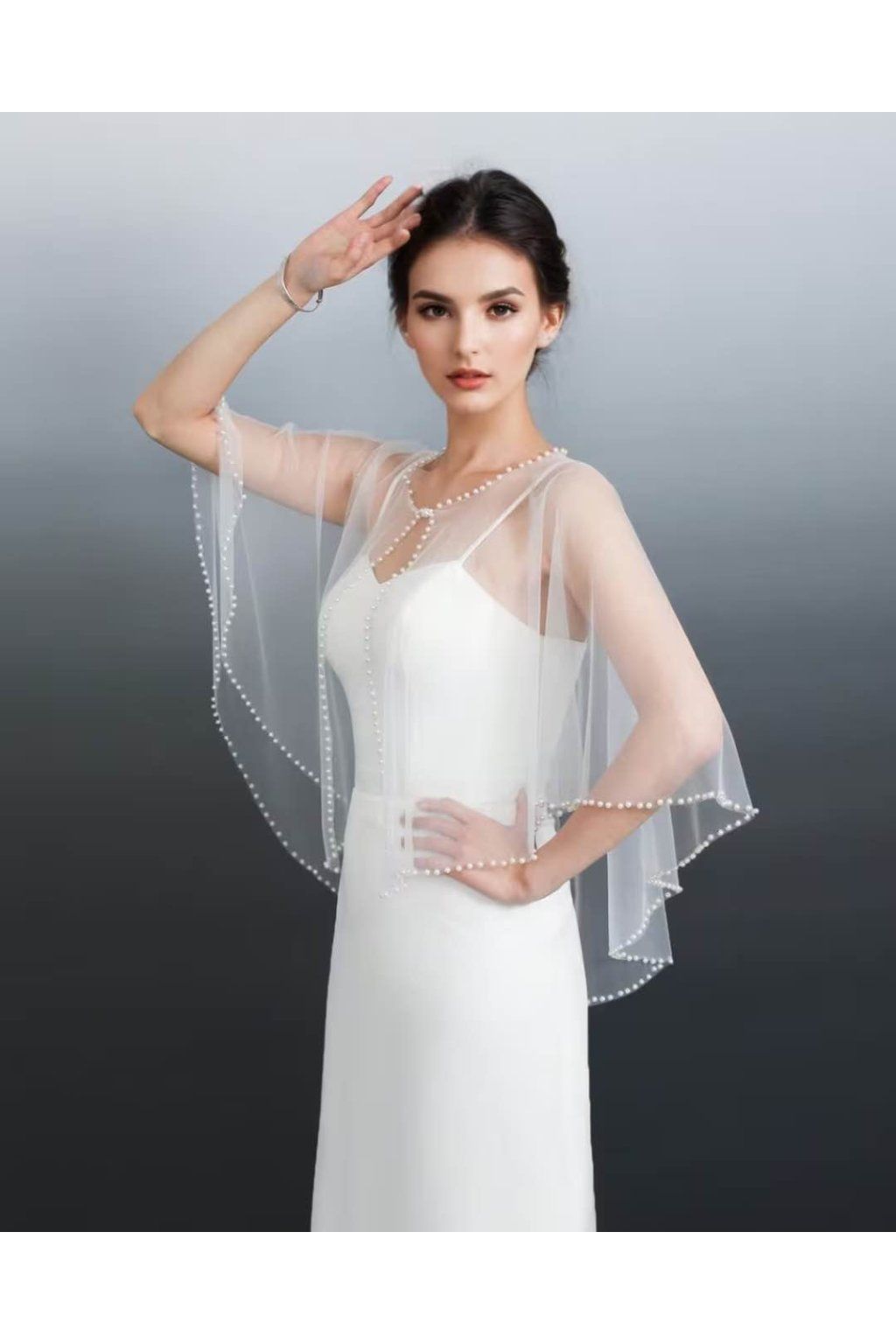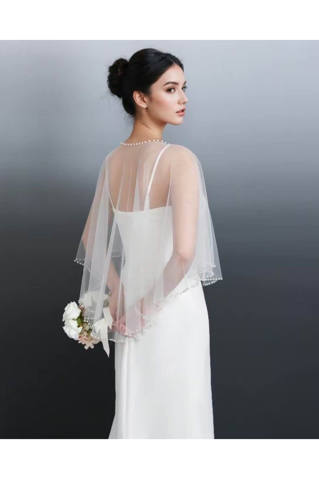Elegantní svatební šál s perličkami je jemný a sofistikovaný doplněk, který krásně doplní svatební i jiné formální šaty. Jednobarevné provedení působí nadčasově a vkusně, zatímco zdobení korálky z umělé perly dodává celému modelu romantický a slavnostní vzhled. Kratší přední část a delší zadní díl vytváří elegantní siluetu a zajišťují působivý efekt při nošení. Šál je ideální pro nevěsty, které chtějí svůj outfit doladit decentním, ale výrazným detailem. Dodává se samostatně, bez dalších doplňků.