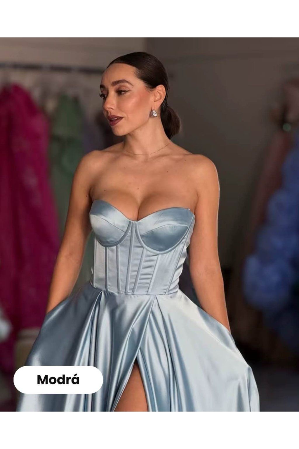 Tera jsou elegantní dlouhé společenské šaty ze saténu se srdcovým výstřihem, odhalenými zády a jemným A-line střihem. Výrazný, ženský a slavnostní model ideální na ples, gala večer i další výjimečné příležitosti.