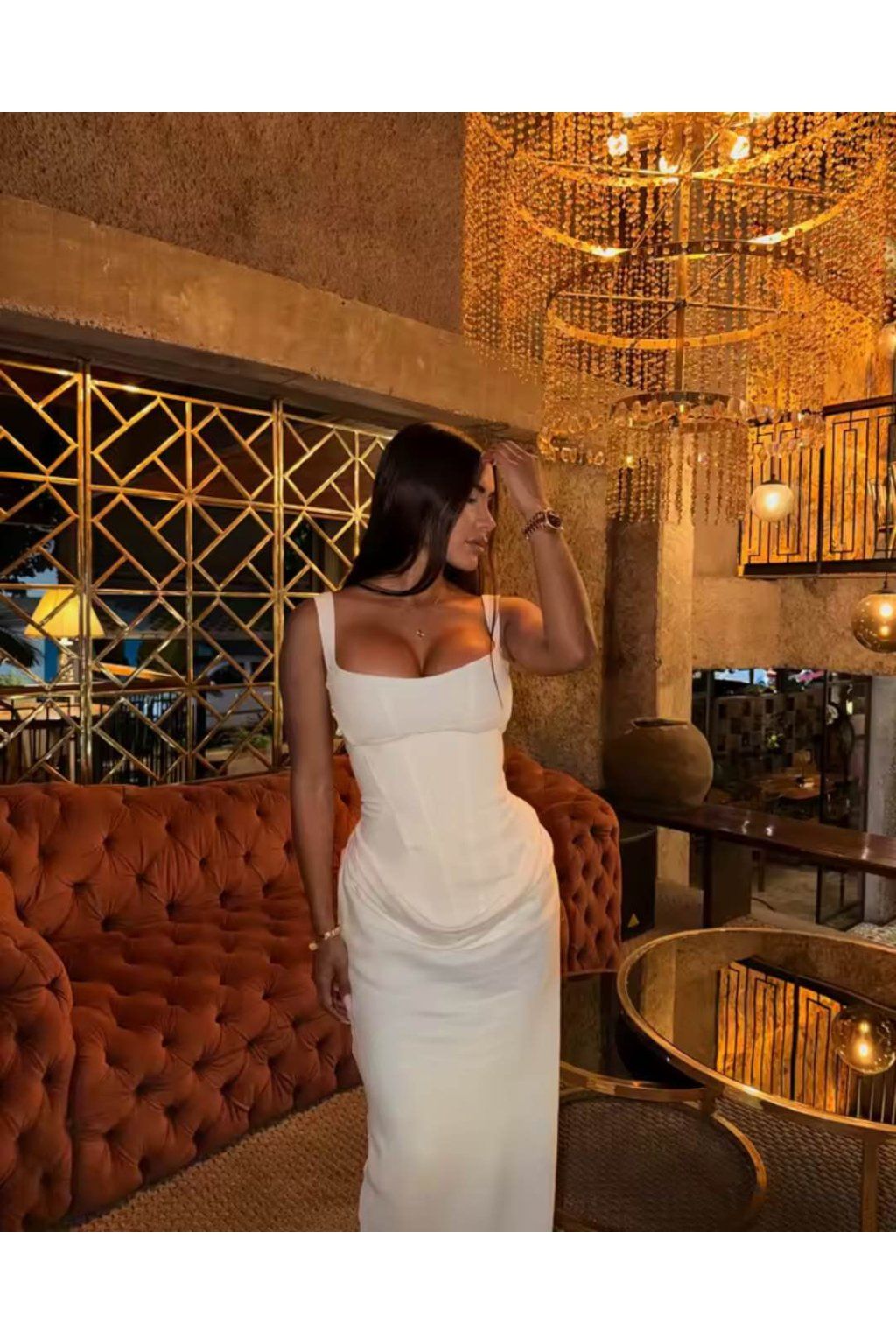 Model zaujme svým hranatým výstřihem, který působí moderně a elegantně zároveň. Ramínkový, bezrukávový střih nechává vyniknout linii ramen a dodává šatům lehkost i jemně svůdný nádech.