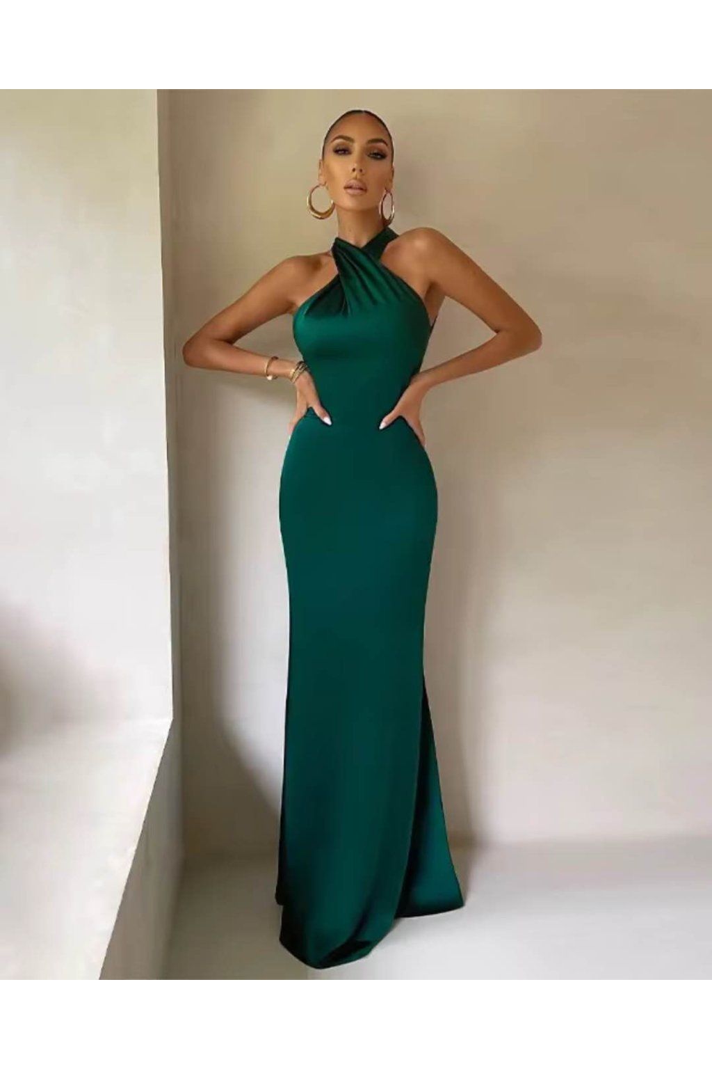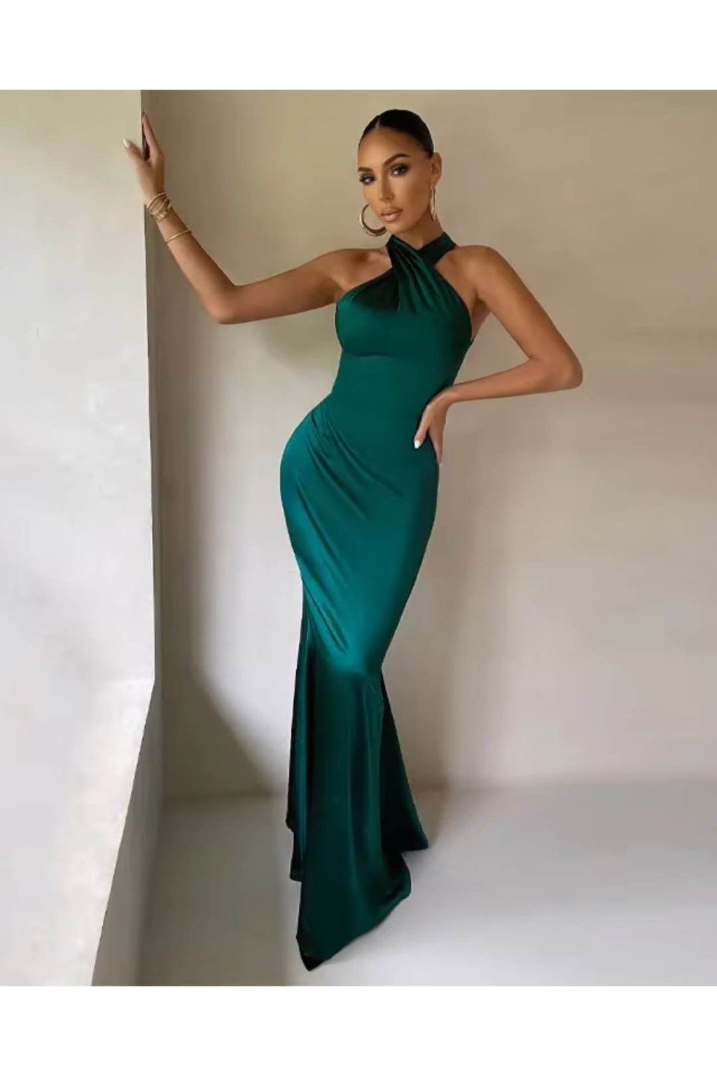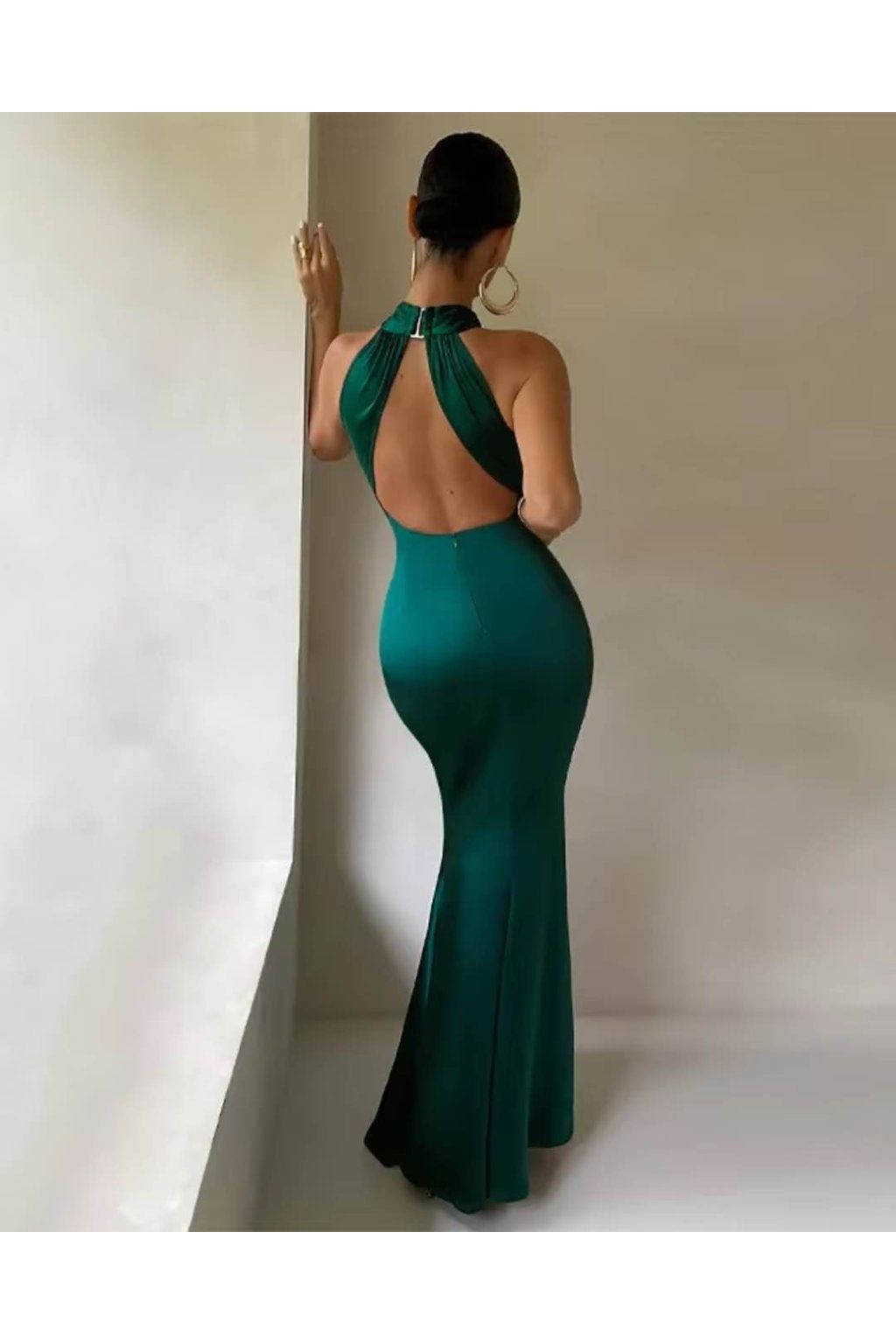 Elegantní dlouhé společenské šaty s halter výstřihem a odhalenými zády. Přiléhavý střih typu mermaid zvýrazní postavu, zatímco pružný materiál zajistí pohodlí při nošení. Ideální na ples, svatbu i jiné slavnostní události.